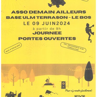 L'association Demain Ailleurs vous invite à ses Journées Portes Ouvertes le 9 Juin 2024 à Terrasson Le Bos Entrée GRATUITE. Démonstration d’ULM. Vols découvertes en ULM pendulaire biplace. Pas de tir a l’arc encadré par un moniteur diplômé. Mur d’escalade encadré par un moniteur diplômé. Activité construction de cerf-volant. Démonstration de delta plane en remorqué. Démonstration de para moteur. Restauration sur place avec buvette. Gonflage de parapente. Parking. A partir […]