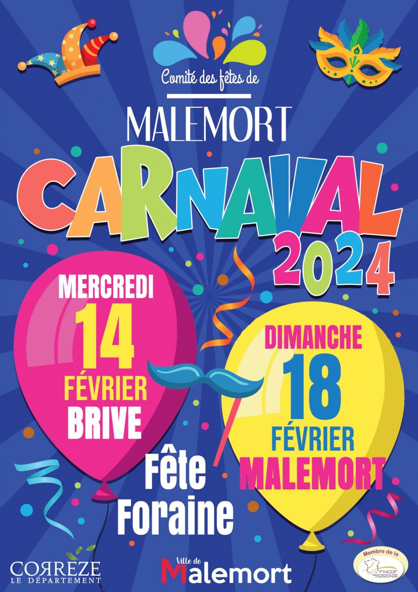 Les 14 et 18 février 2024, le comité des fêtes de Malemort vous attends pour son traditionnel carnaval. Venez admirer ses chars fleuris, le mercredi dans les rues de Brive et le dimanche à Malemort. Et n’oubliez pas de faire un petit tour à la fête foraine qui sera installée à Malemort
