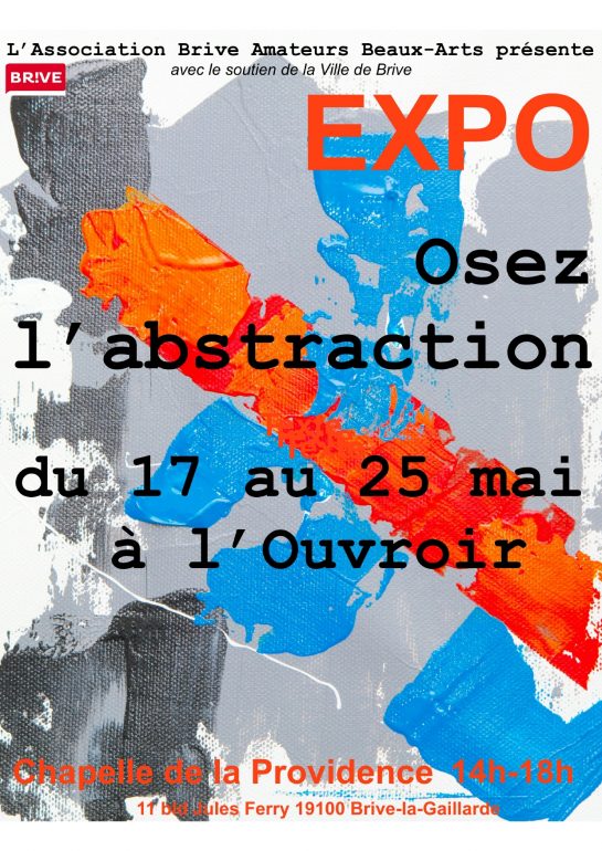Les adhérents de Brive Amateur Beaux-arts vous proposent de découvrir leur dernière exposition « Osez l’abstraction ». Ils vous invitent à vous approprier les œuvres et à vous laisser porter par le jeu des couleurs et des textures, à ressentir les émotions et les sentiments qui s’en dégagent.