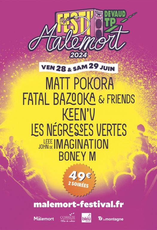 FESTI'MALEMORT DEVAUD TP 2024 Le 28 et le 29 juin 2024 à partir de 18h 20 PASS FOSSE sont en jeu !!! Festi'Malemort Devaud TP s'agrandit et revient pour sa 3ème édition ! ► 2 soirées détonantes et surprenantes dans une ambiance amicale et décontractée.Le sens de la fête c’est à Malemort avec : Matt Pokora Fatal Bazooka & Friends Keen'V Les Négresses vertes Leee John de Imagination Boney M Prix des places pour les concerts : Prestation Tarif […]