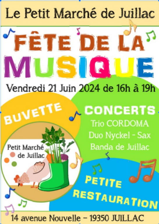 À l’occasion de la Fête de la Musique 2024, Le Petit Marché de Juillac (PMJ) vous invite à venir passer un moment de détente-qui ne fera pas de mal- autour de trois concerts gratuits organisés ce vendredi 21 juin de 16h à 19h14 avenue Nouvelle 19 350 JuillacSe succèderont trois groupes Juillacois de grande qualité :– le trio CORDOMA– répertoire français– le duo NYCKEL-SAX, jazz occitan– La BANDA de Juillac avec ses instruments énergétisantBuvette et de la restauration maison tout au long de l’après-midi.Évènement accessible à toutes et à tous.Parking de la Maison de Santé à 50 m.VENEZ NOMBREUX !L’Association du Petit Marché de JuillacCONTACT : lepetitmarchedejuillac@gmail.com
