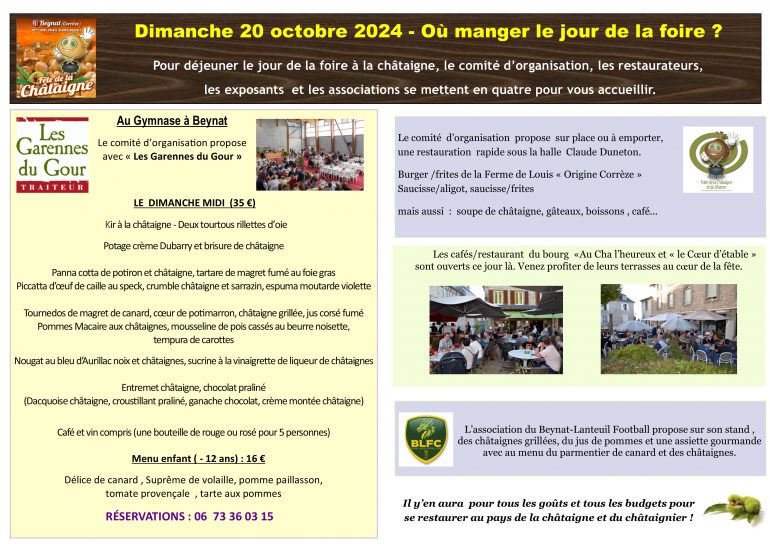 - Restauration sur le stand du comité (Halle), dans les cafés, les restaurants de la commune et menu officiel de la fête au Gymnase à Beynat. Le comité d’organisation de la foire avec le traiteur «Les Garennes du Gour » propose le dimanche midi un repas au gymnase (menu à 35 €).